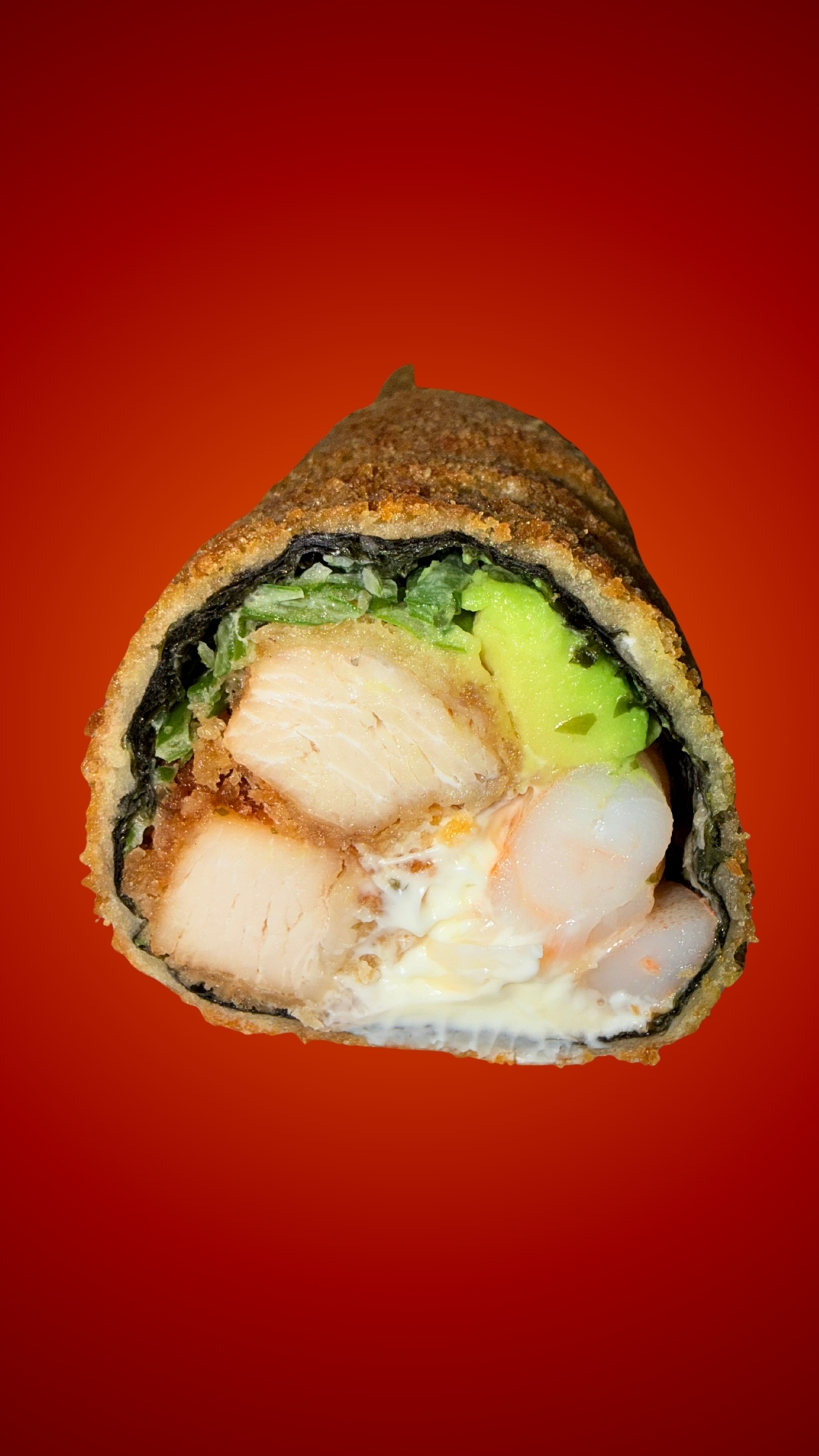 Pollo apanado, camarón, queso crema, palta y cebollín